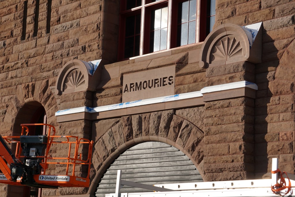 Fundy Stonecraft was contracted to design and carve replacement finial stones on the South Wall of the North Park Armoury in Halifax, NS. The design was created with reference to the heavily deteriorated four original stones, each of which offered some dimension or detail of the original design. The challenging aspect of this design is that the location of the centre point of the semicircle is higher than the radiating point of the lobes (see drawings for explanation), making the semicircle elongated. This original architectural drawings did not show this. I submitted a design proposal and carved both finials (4 stones).