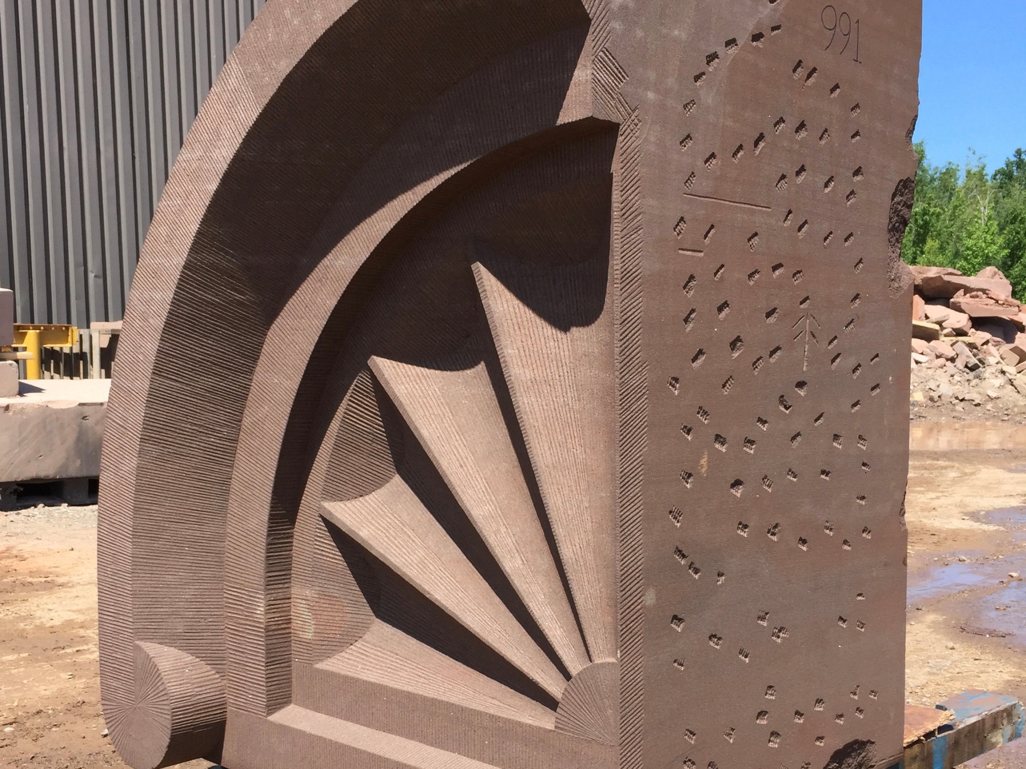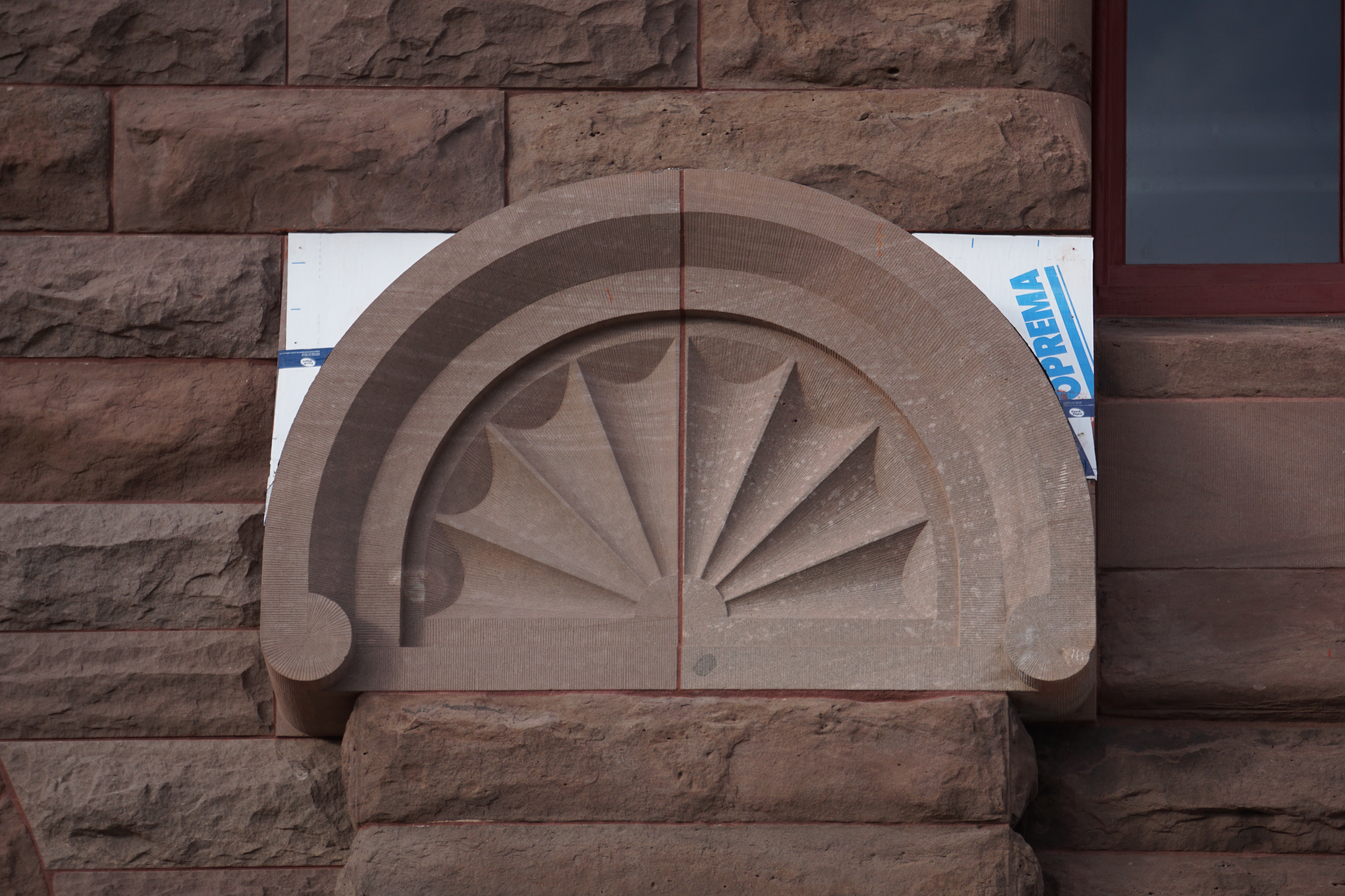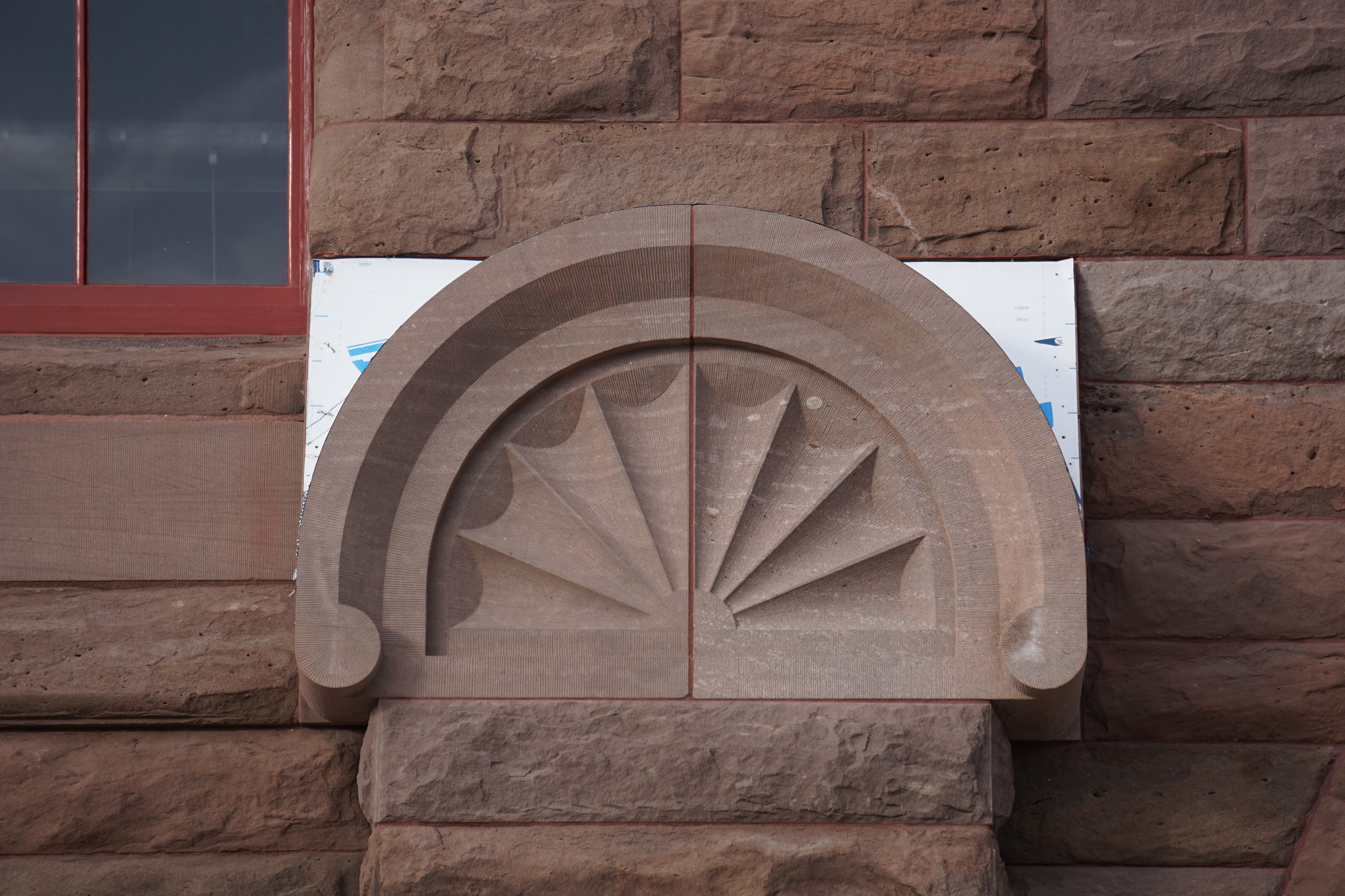 Fundy Stonecraft was contracted to design and carve replacement finial stones on the South Wall of the North Park Armoury in Halifax, NS. The design was created with reference to the heavily deteriorated four original stones, each of which offered some dimension or detail of the original design. The challenging aspect of this design is that the location of the centre point of the semicircle is higher than the radiating point of the lobes (see drawings for explanation), making the semicircle elongated. This original architectural drawings did not show this. I submitted a design proposal and carved both finials (4 stones).
