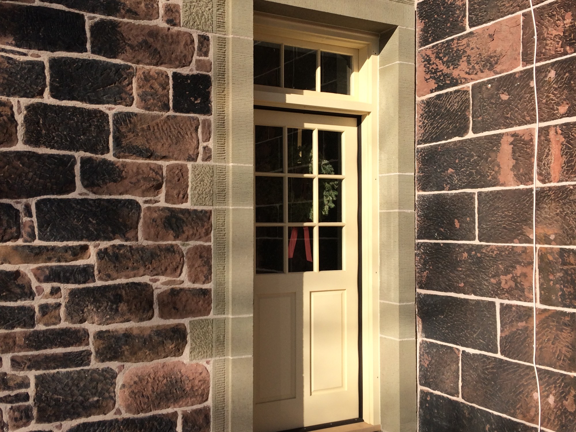 The main building was constructed in 1838. It has two walls constructed of rubble sneck bond and two, more visible, walls constructed of ashlar. The new entrance is on a rubble wall, therefore, the design was intended to mimic the windows on the same floor of the corresponding wall. These windows, shown below, have a flat brownstone arch above a greenstone lintel, rybits, and sill. The new design would copy the mouldings and tooling of these stone but, modify the bonding to better distribute load into the length of the wall (which has been the cause of numerous repairs on the original design).