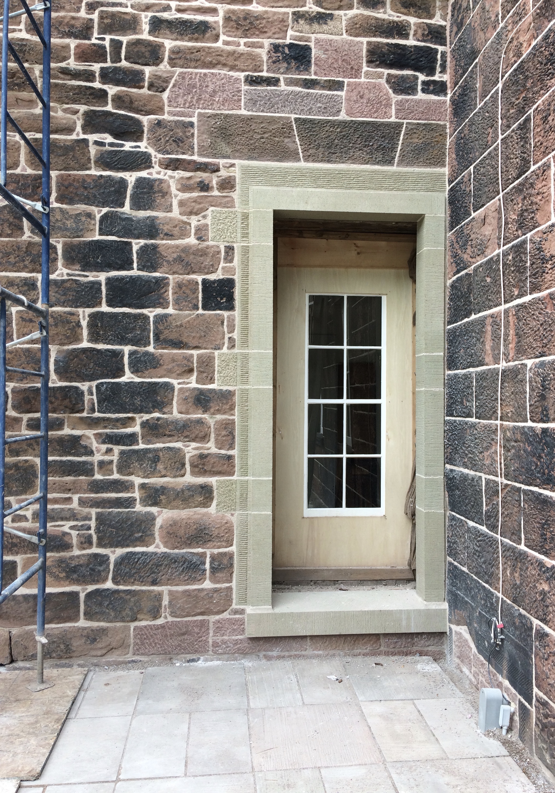 Fundy Stonecraft was hired to design, carve, and construct a new rear entrance to the 1838 Cranewood building in order to facilitated its adaptive reuse as a restaurant. The doorway provides its patrons access to the southern facing patio, creating additional seating room the warmest and sunniest area of the building. This intervention was chosen in a location that had previously been altered from its original form in a was in need of repair so to lessen the impact to the original fabric. Modifying the opening would address these needed repairs and serve the modified use of the building.