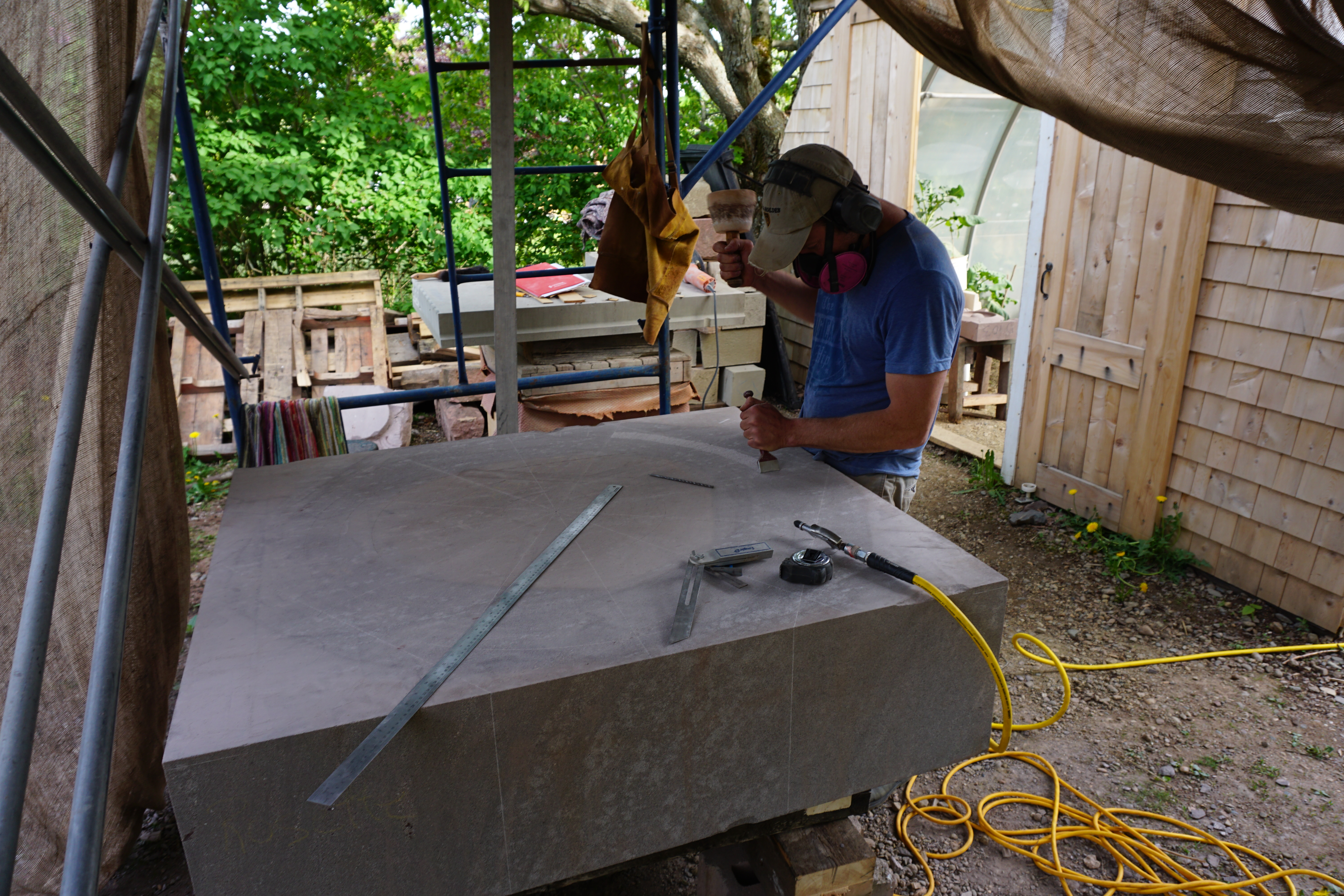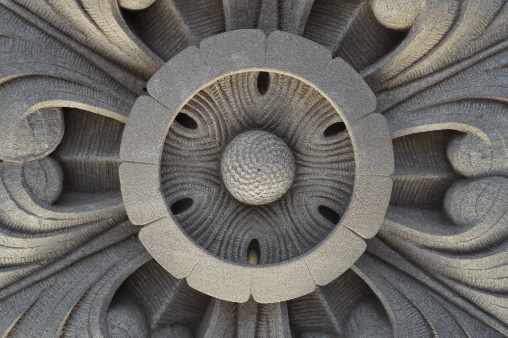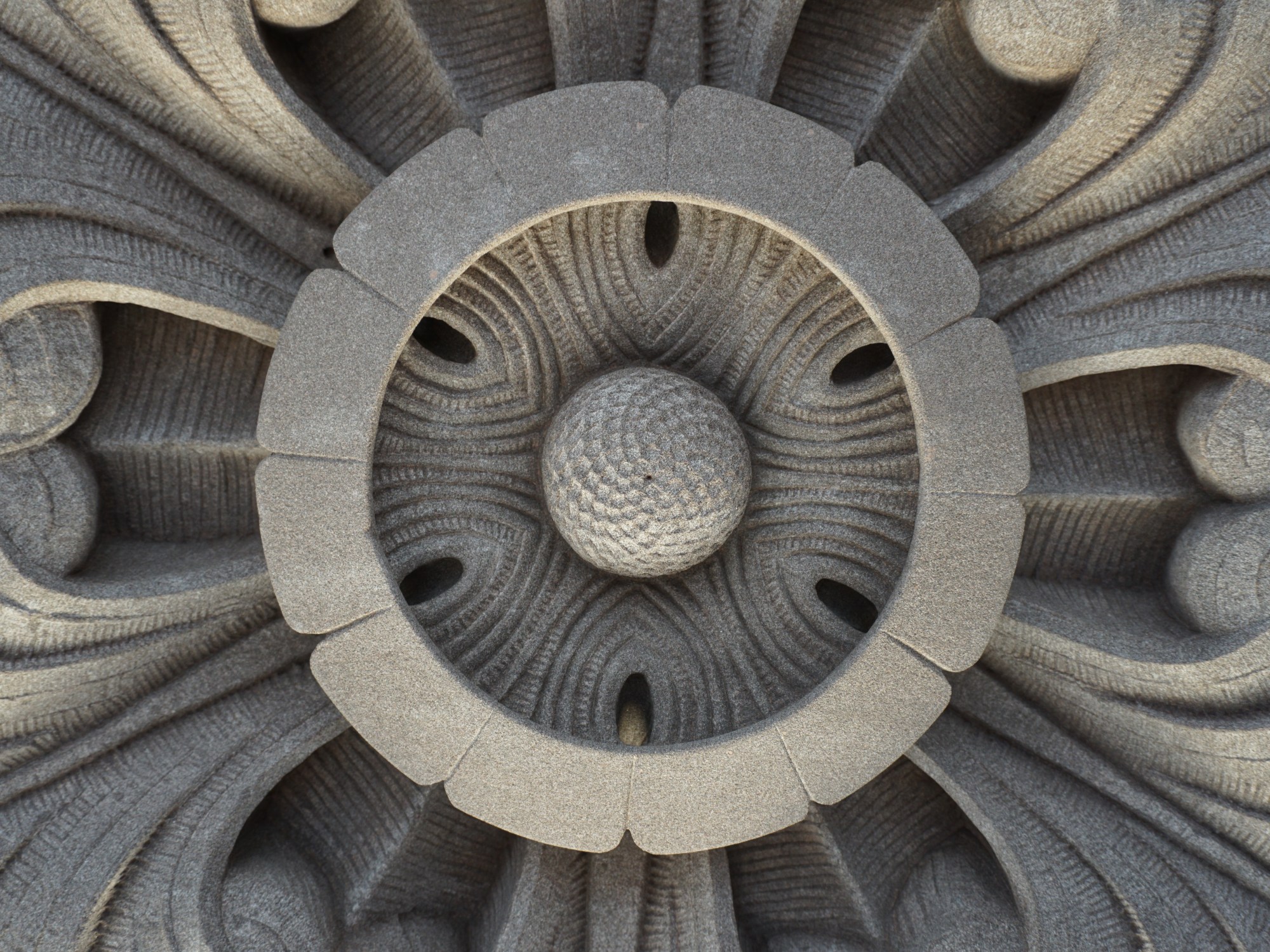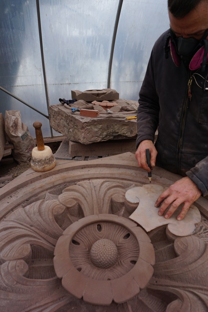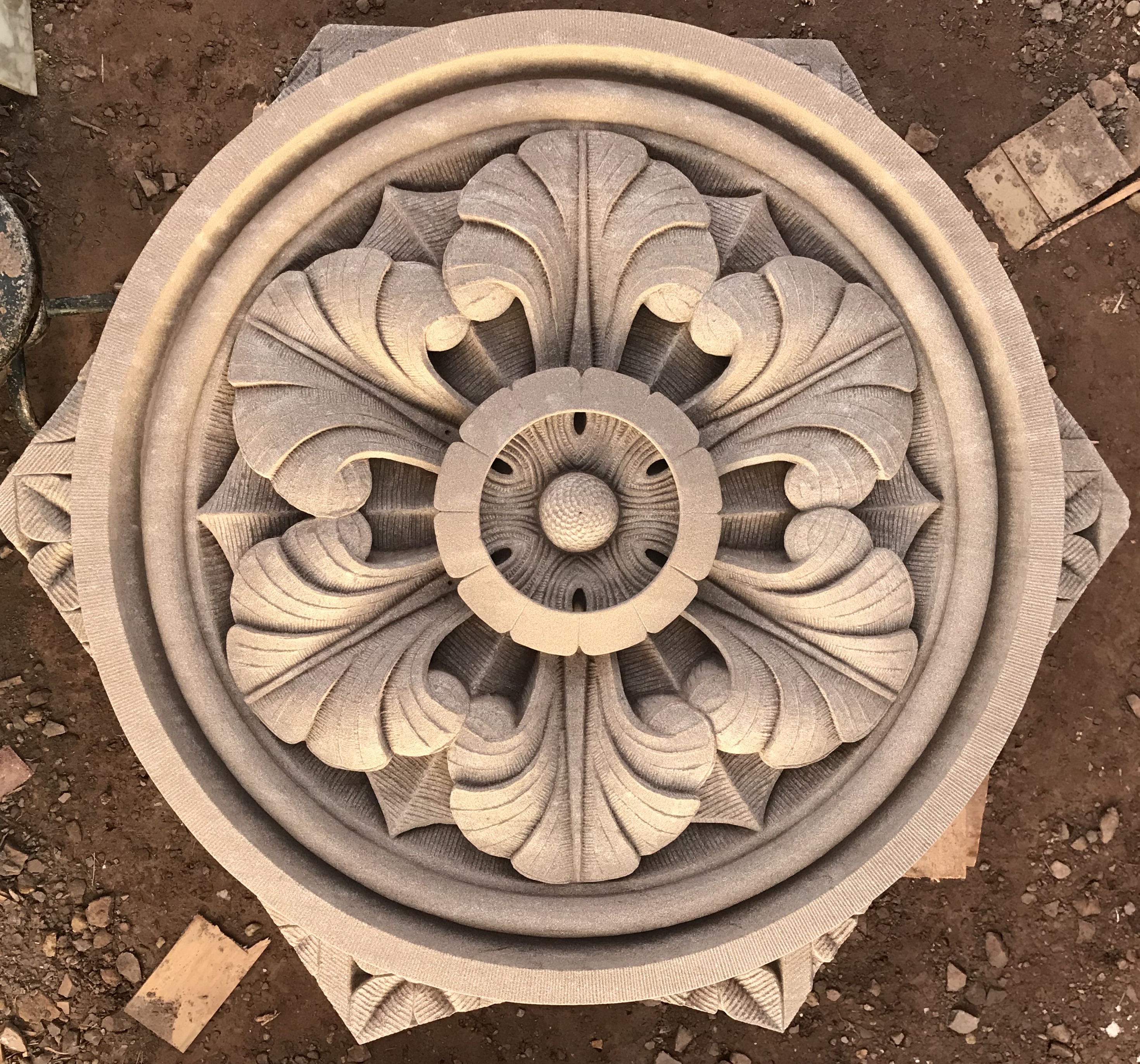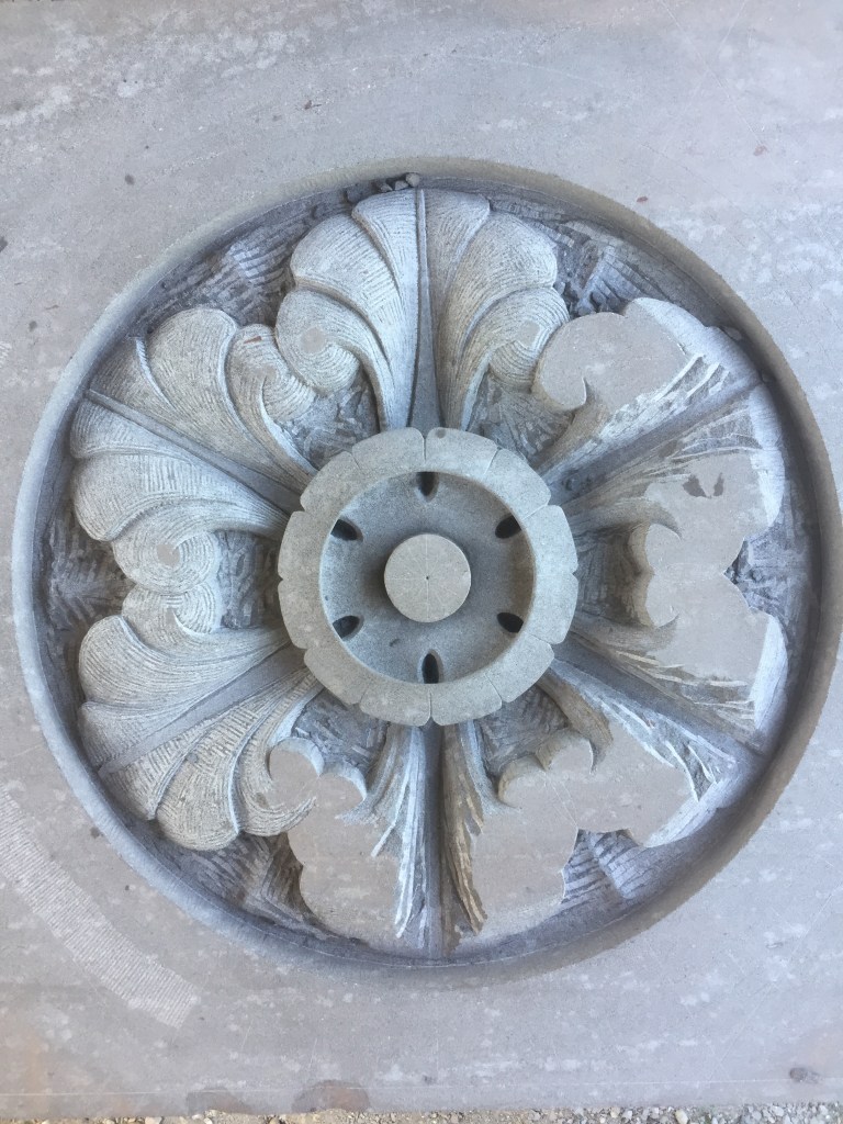 Fundy Stonecraft was contracted by Dan Lepore & Sons to produce two replacement for the deteriorated rosette medallion above the Entrance of Stuart Hall on the grounds of Princeton Theological Seminary in Princeton, New Jersey. This work has involved traveling to site to collect design information for the creation of a replacement design proposal. The design was created through reference to historical photos of the original, detailed measurements onsite, and design patterns and textures elsewhere on the building.