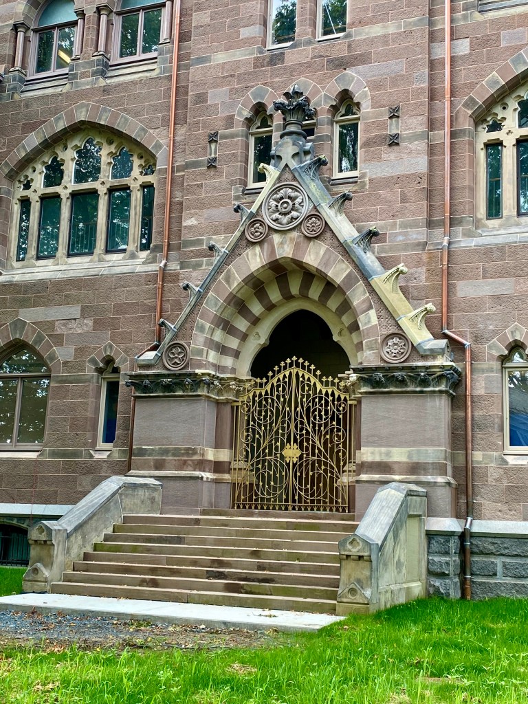 Fundy Stonecraft was contracted by Dan Lepore & Sons to produce two replacement for the deteriorated rosette medallion above the Entrances of Stuart Hall on the grounds of Princeton Theological Seminary in Princeton, New Jersey. This work has involved travelling to site to collect design information for the creation of a replacement design proposal. The design was created through reference to historical photos of the original, detailed measurements onsite, and design patterns and textures elsewhere on the building.