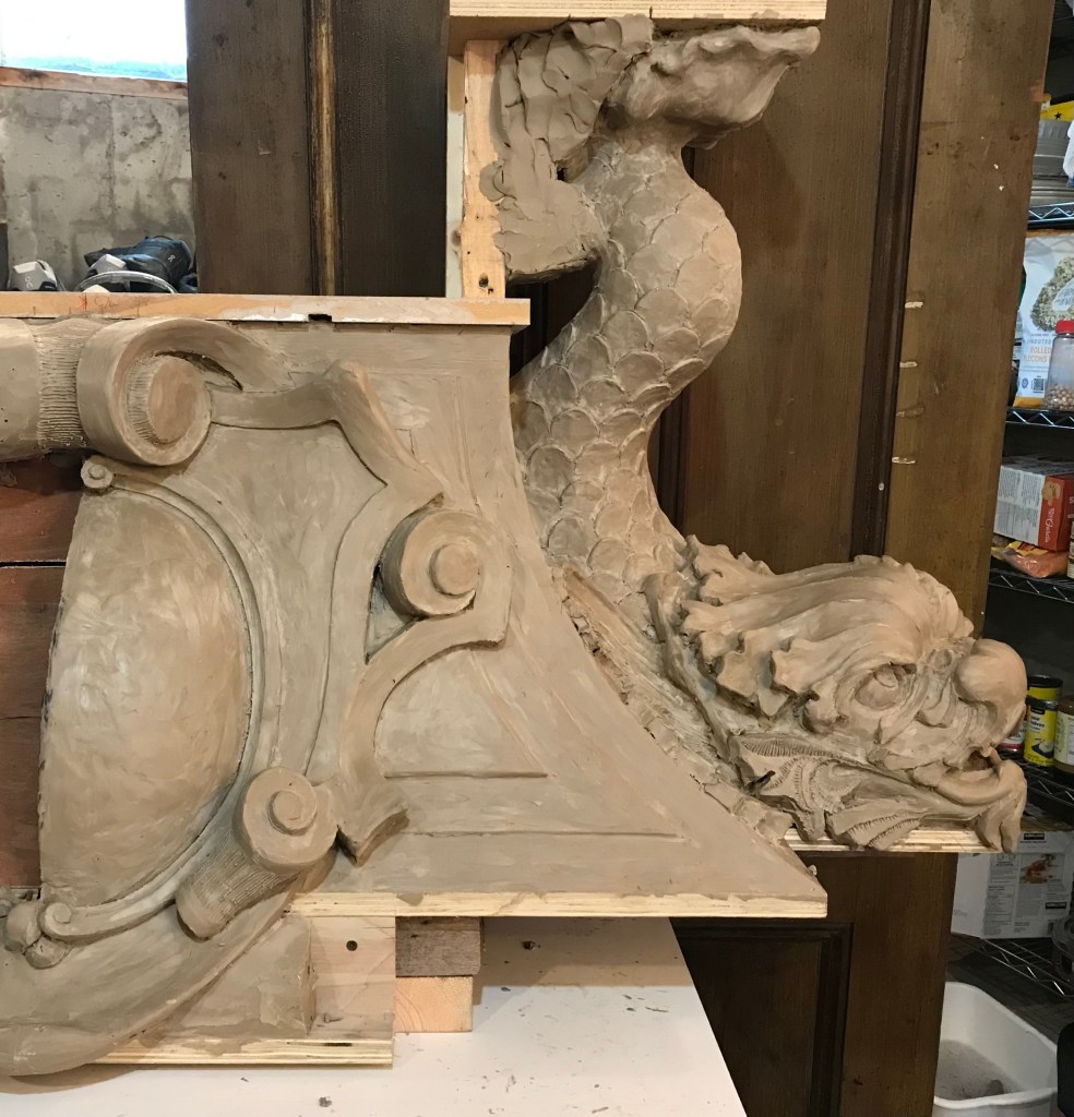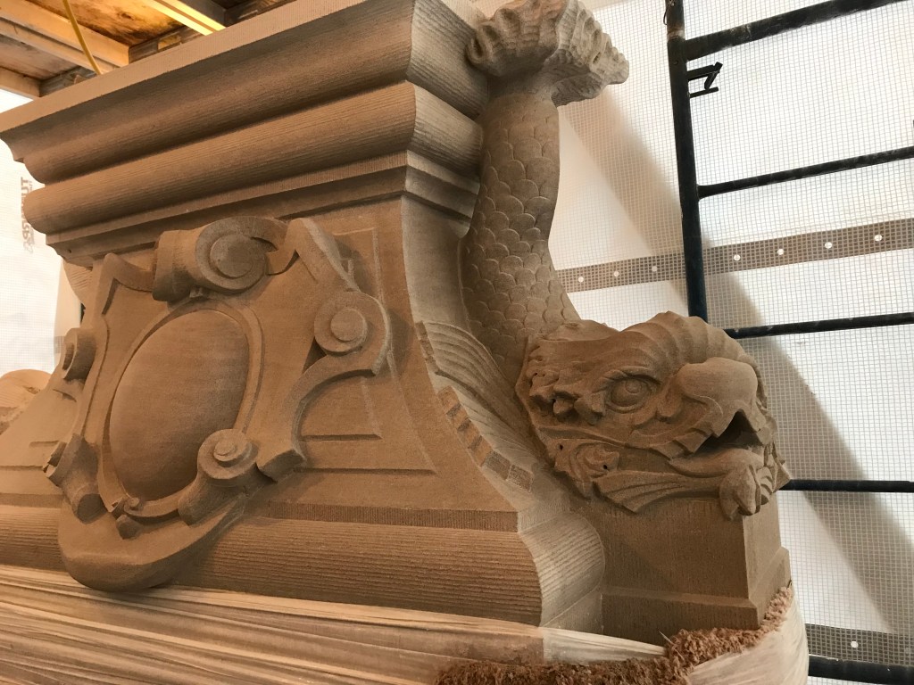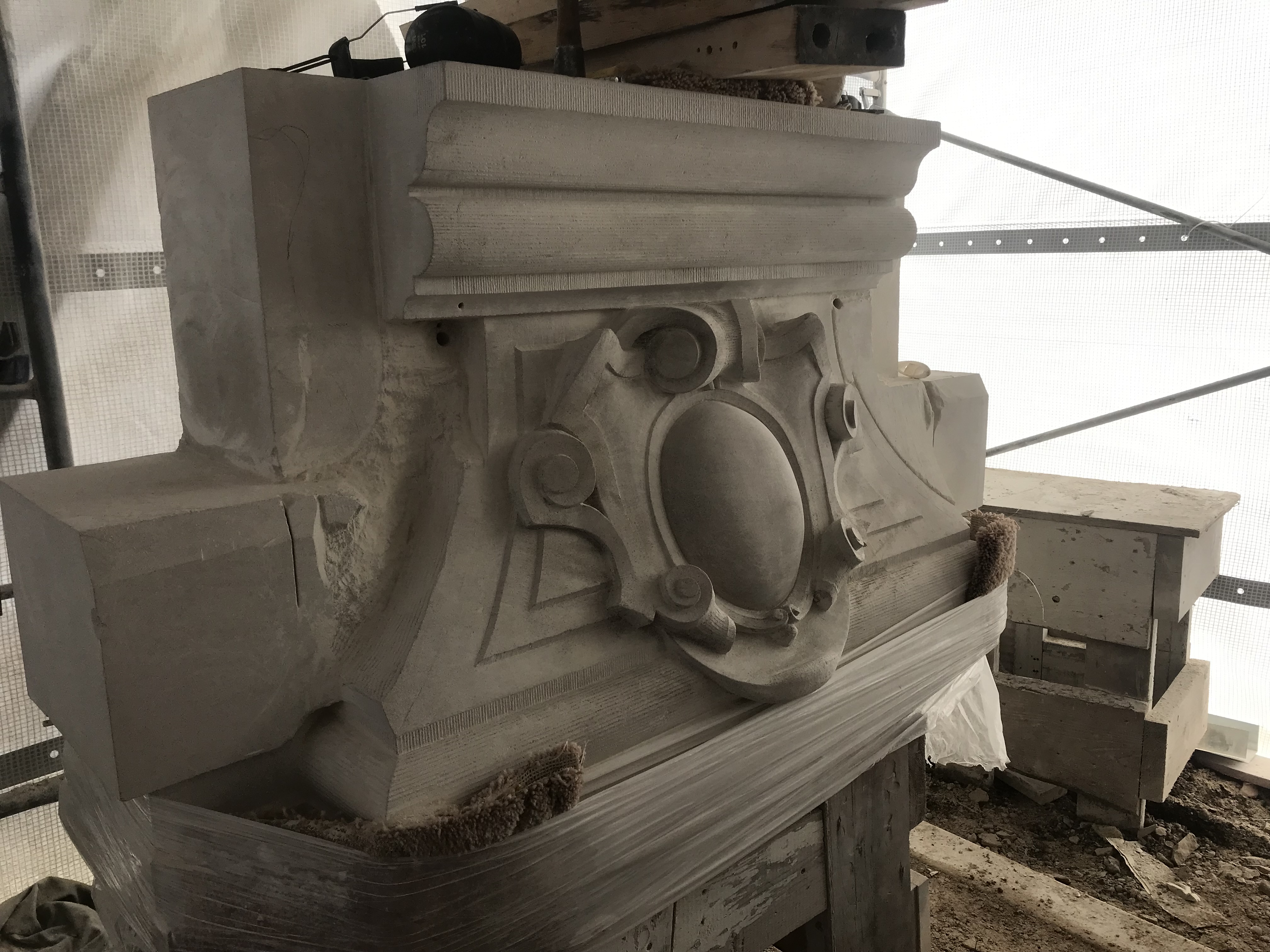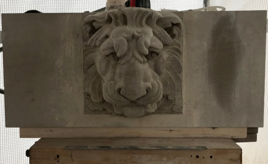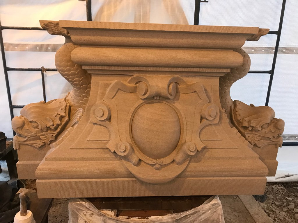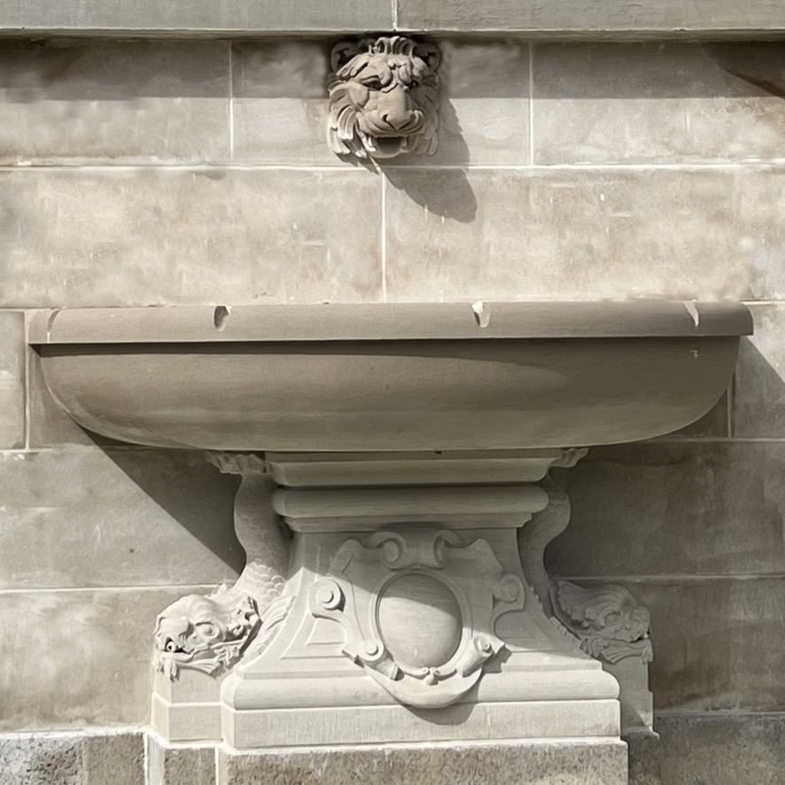 Fundy Stonecraft was contracted to design and carve three replacement stones for a badly deteriorated fountain on the historic Twombly Florham Estate, now part of Farleigh Dickenson University. The design of the replacement stones involved detailed measurements of the existing stones, researching historic photographs to provide missing information (bowl dimensions, carving details), and computer and clay modelling of the bowl and pedestal. The replacement design proposal was submitted: