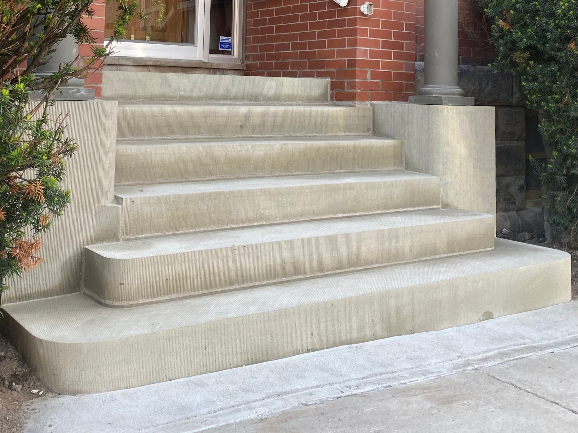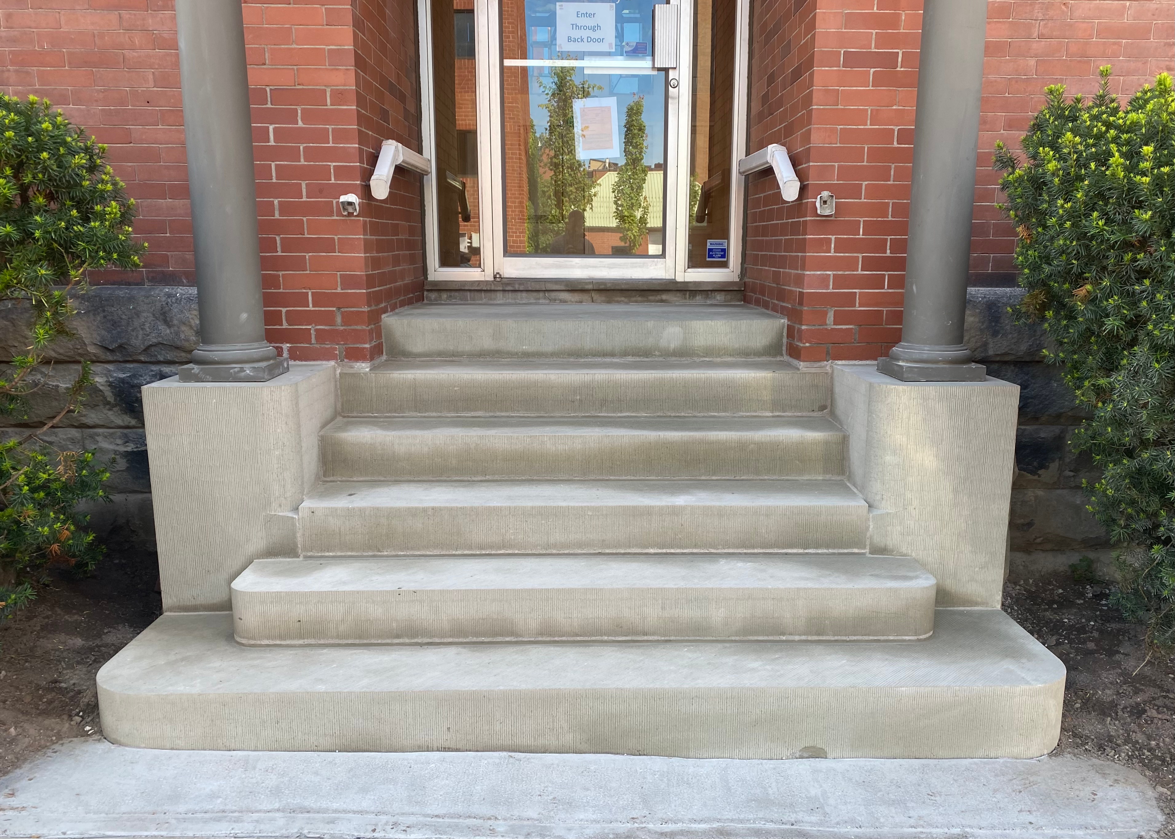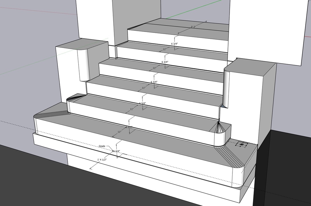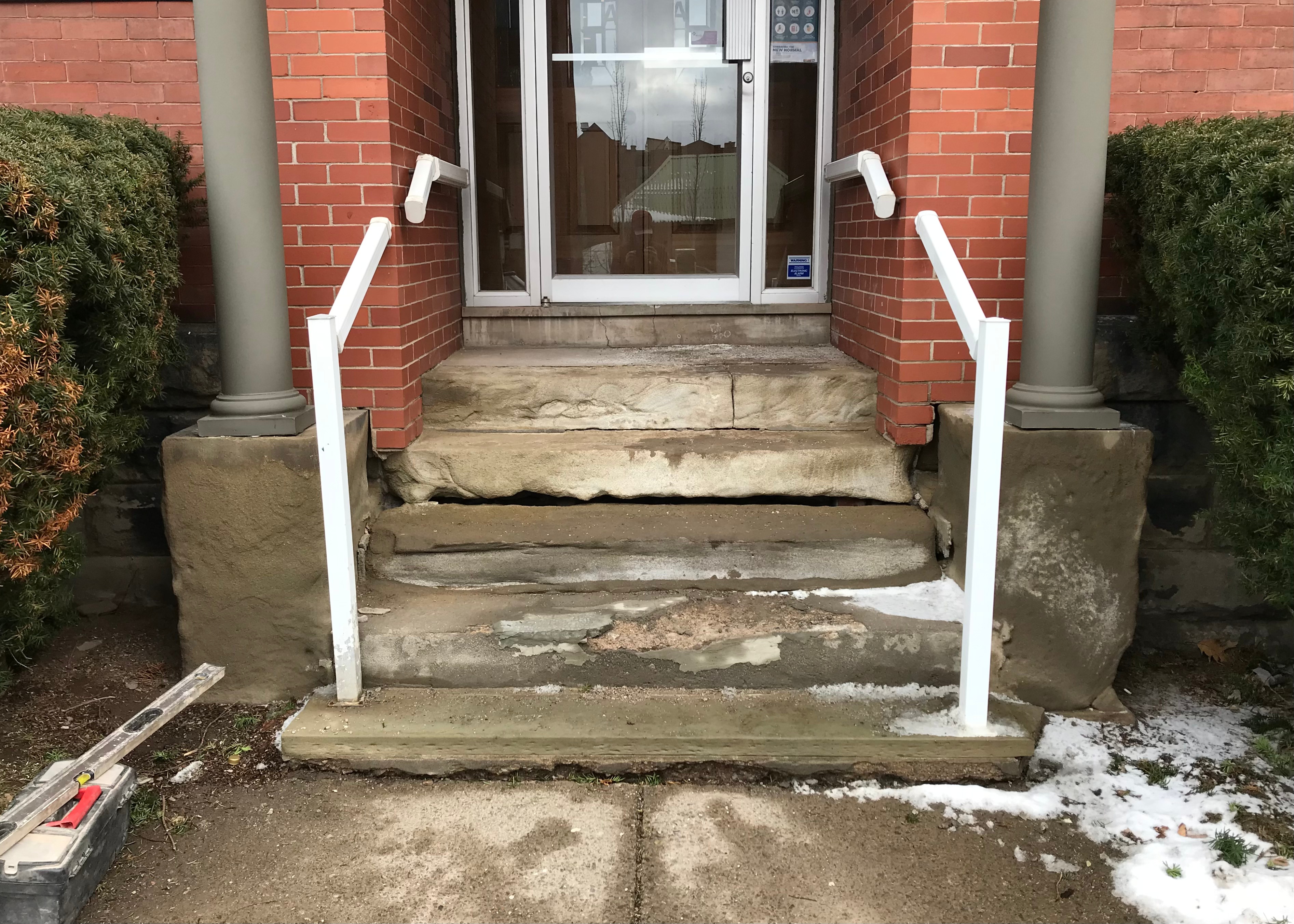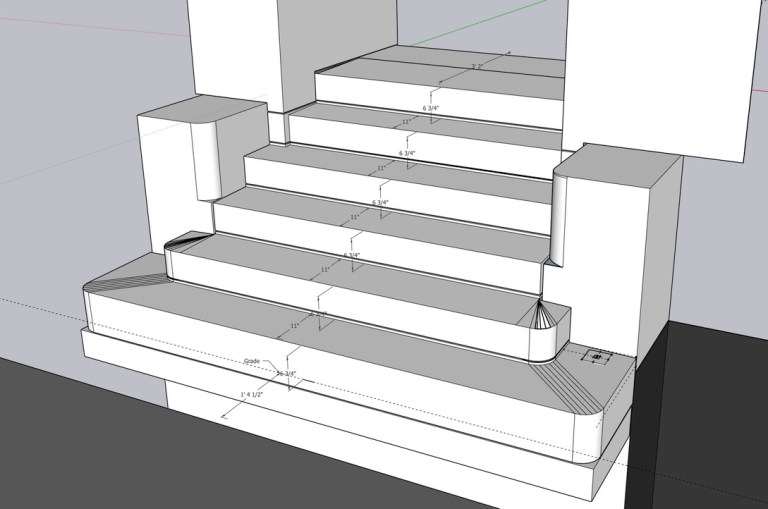 The original entrance was significantly deteriorated by the use of deicing salts, exposure to water, and poor repairs. I designed the new entrance with a raised mortar bed to reduce moisture stress on the lime mortar.