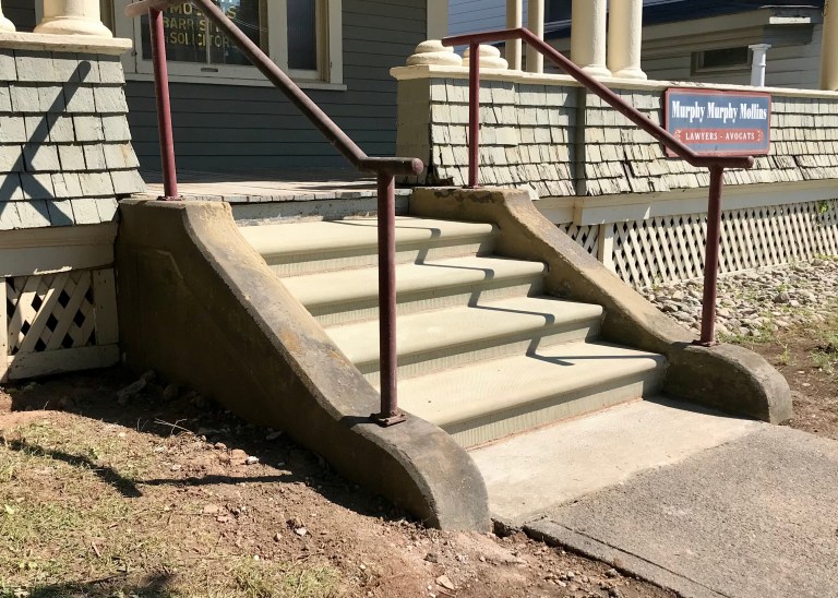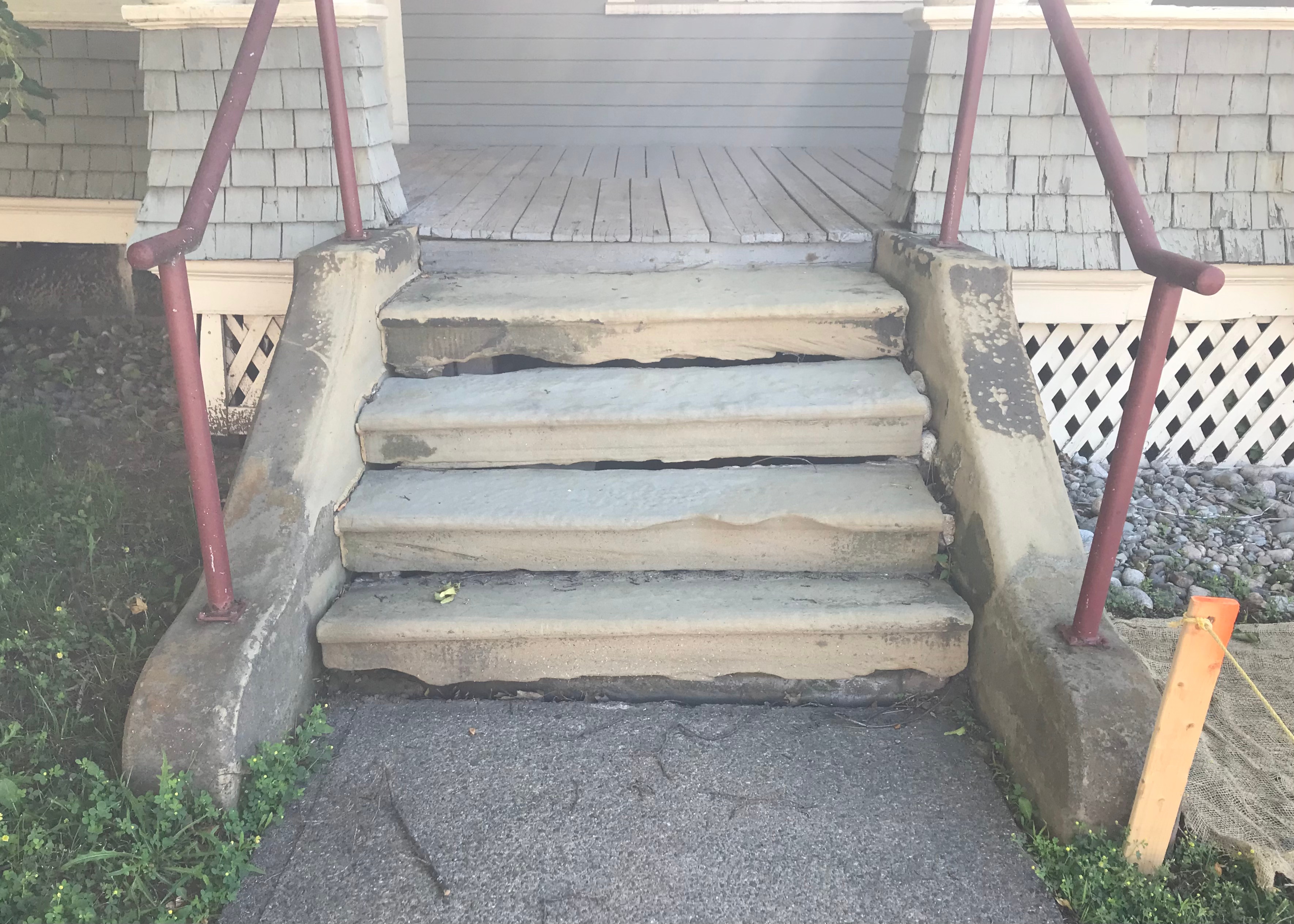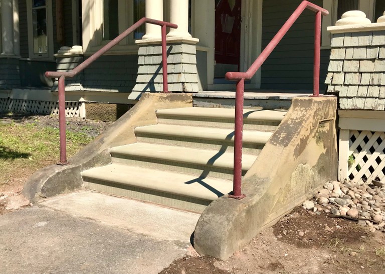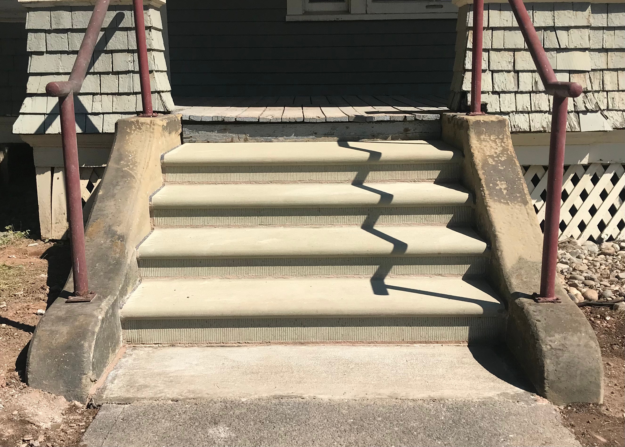 The conservation of this entrance involved the replacement of the stair treads and foundation and the reuse of the large stone rails.