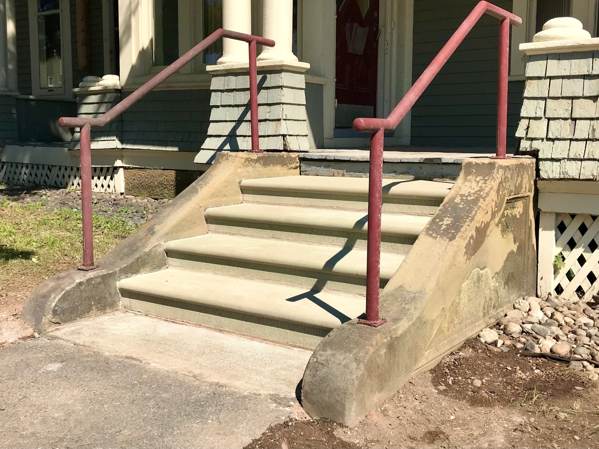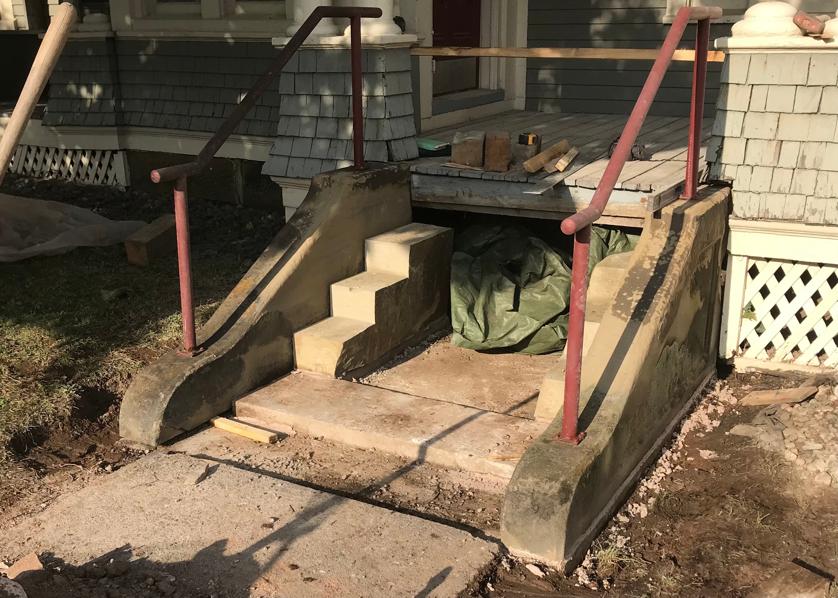 The conservation of this entrance involved the replacement of the stair treads and foundation and the reuse of the large stone rails.