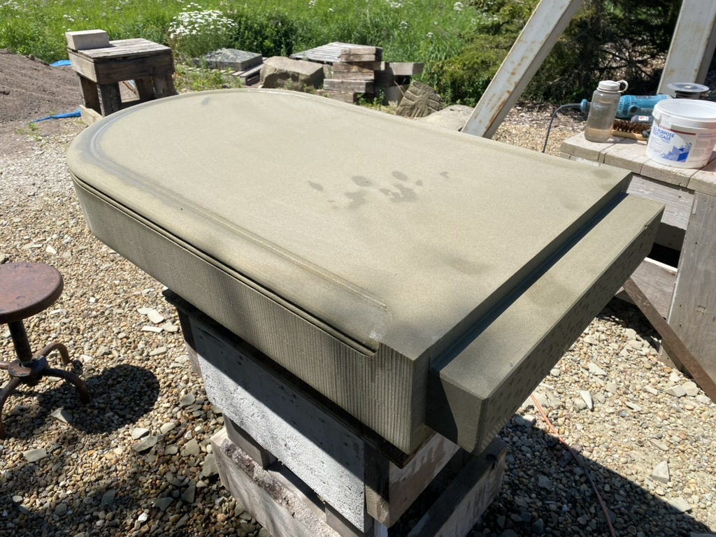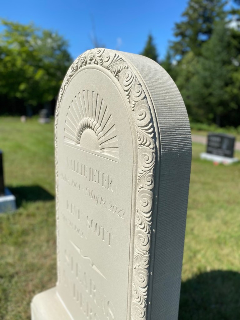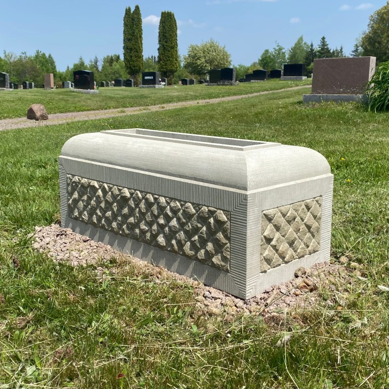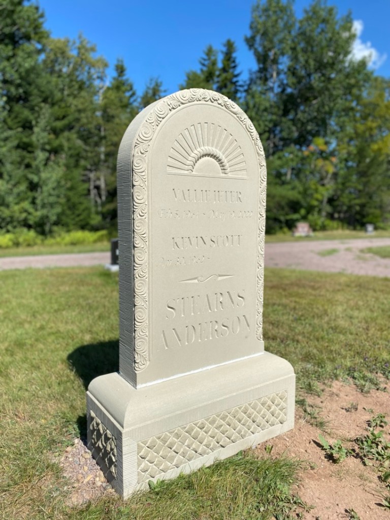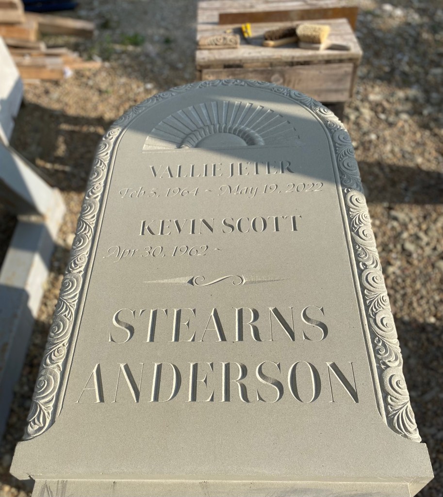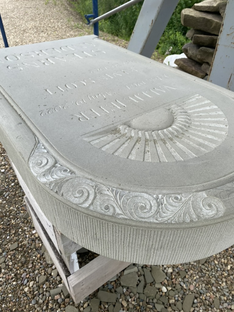 The general form of the headstone was inspired by a range of historic headstones in the cemetery. Semicircular tablets with simple mouldings and a wide base are common among 18th and 19th century sandstone and marble headstones. To personalize the stone, I worked with the client to add meaningful designs to the face and moulding of the tablet. The remaining surfaces are finished using the same tools and methods as done in the past.