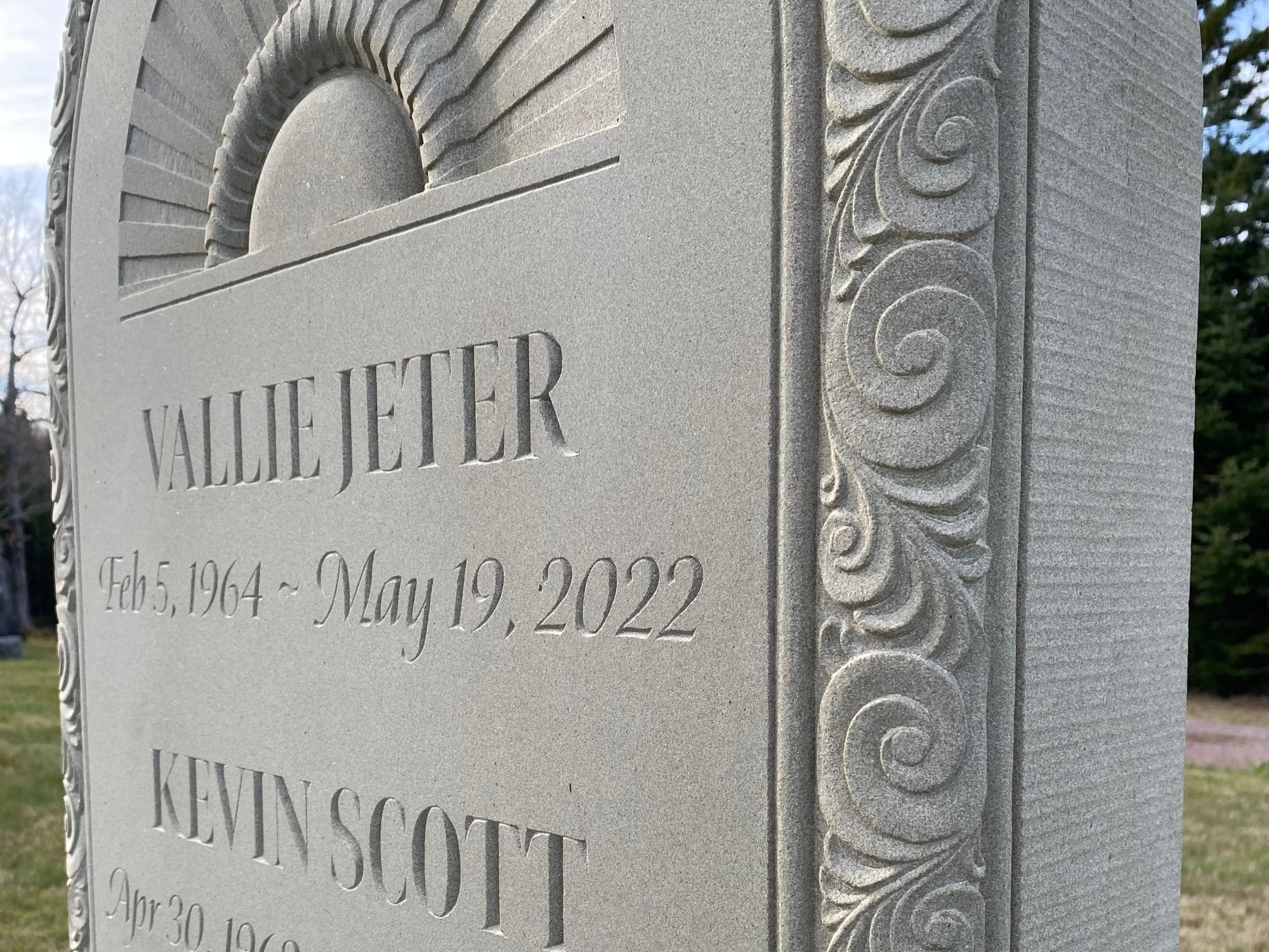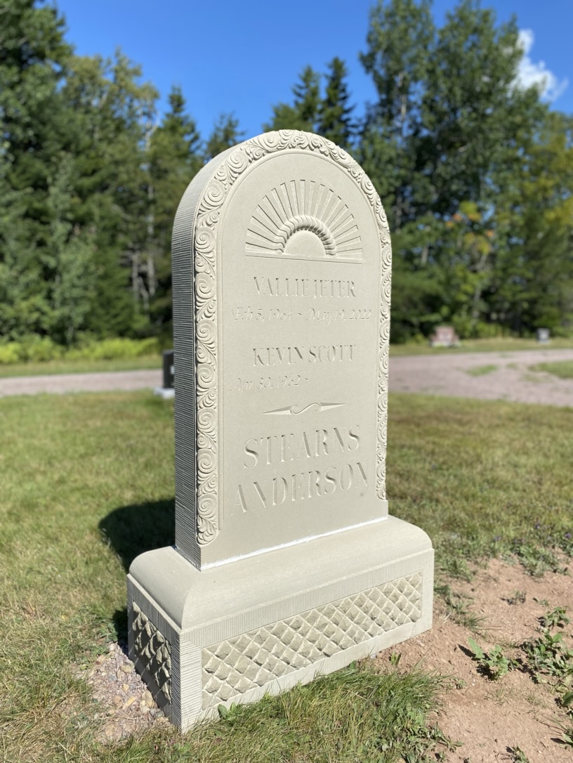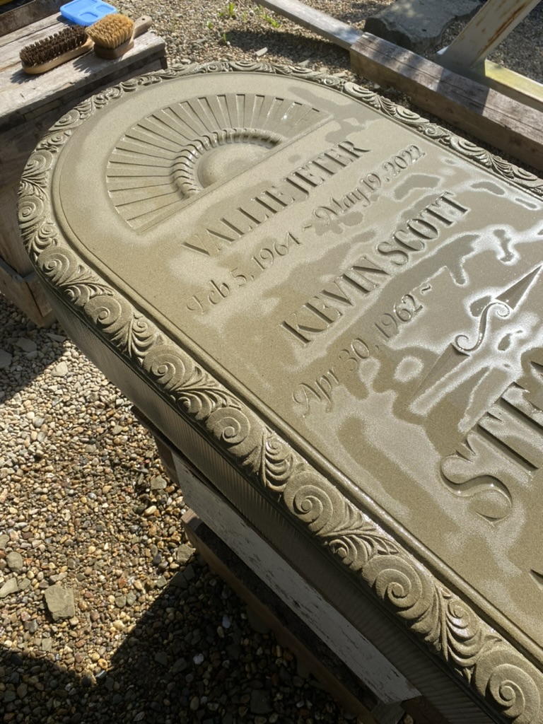 The general form of the headstone was inspired by a range of historic headstones in the cemetery. Semicircular tablets with simple mouldings and a wide base are common among 18th and 19th century sandstone and marble headstones. To personalize the stone, I worked with the client to add meaningful designs to the face and moulding of the tablet. The remaining surfaces are finished using the same tools and methods as done in the past.
